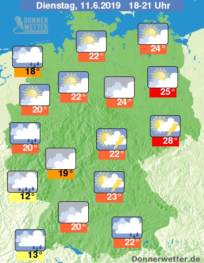 Am Abend muss in Sachsen, Thüringen und Nordbayern mit teils kräftigen Gewittern gerechnet werden. Westlich des Rheins fällt aus kompakten Schichtwolken gelegentlich Regen. Sonst gibt es eine Mischung aus dichteren Wolken und kurzen Aufheiterungen, Regen oder Schauer fallen jedoch nur vereinzelt.