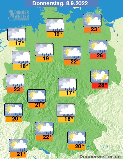 Am Donnerstag zeigt sich der Himmel über weiten Landesteilen wechselnd oder stark bewölkt und verbreitet muss mit Schauern und lokalen Gewittern gerechnet. Örtlich Starkregengefahr! Vor allem Westen und Nordwesten sind auch länger anhaltende Niederschläge möglich. Weitgehend trocken bleibt es bei einem Mix aus Sonne und Wolken im äußersten Nordosten.