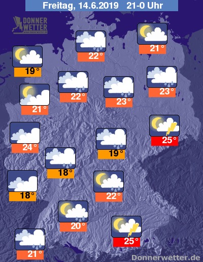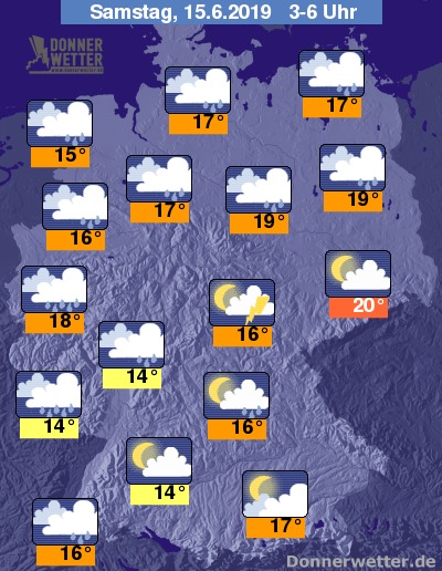 Während der zweiten Nachthälfte können von Frankreich und Benelux her neue kräftige Regenfälle, örtlich von Blitz und Donner begleitet in die westlichen Bundesländer ziehen. Stellenweise kann es zu Unwettern und der Gefahr von kleinräumigen Überschwemmungen kommen. Sonst wechseln sich dichte Wolken mit Mond und Sterne ab. Insbesondere in der Mitte und im Norden muss mit örtlichen Regenschauern und einzelnen Gewittern gerechnet werden.