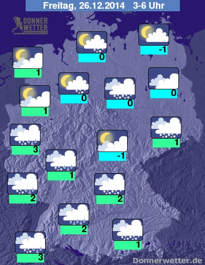 In der Nacht zum Freitag fällt zeitweise weiterer Schnee, in der Südwesthälfte des Landes auch Schneeregen und teils auch Regen, dazu kann es wiederum sehr glatt auf den Straßen werden. Meist trocken und auch häufiger aufgelockert bewölkt ist es in weiten Teilen Nord- und Nordwestdeutschlands, hier ist nur vereinzelt etwas Schnee möglich. Die Temperatur sinkt auf 3 Grad am Niederrhein und etwa -1 Grad an der Müritz.