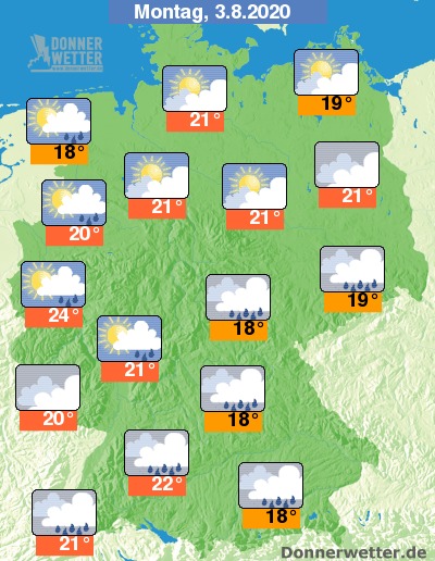 Am Montag halten sich über der Südhälfte und den westlichen Landesteilen meist dichte Wolken und es bilden sich zeitweise Schauer. Im übrigen Bundesgebiet ist es teils stark, teils aufgelockert bewölkt, dabei bleibt es zumeist trocken. Die Temperatur liegt nur noch bei 18 Grad in Aurich und bis 24 Grad in der Kölner Bucht.