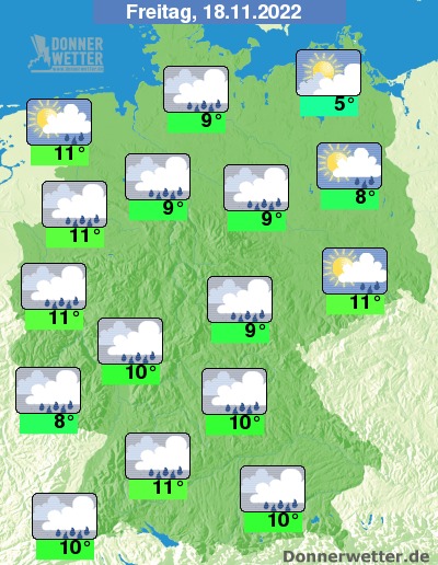 Am Freitag ist es größtenteils stark bewölkt oder bedeckt, nur teilweise kann es auch mal etwas auflockern. Es fällt zeitweise Regen bei Höchstwerten von 5 Grad in Neubrandenburg und bis 11 Grad an Rhein und Ems. An der Ostsee weht ein teils stürmischer Wind.