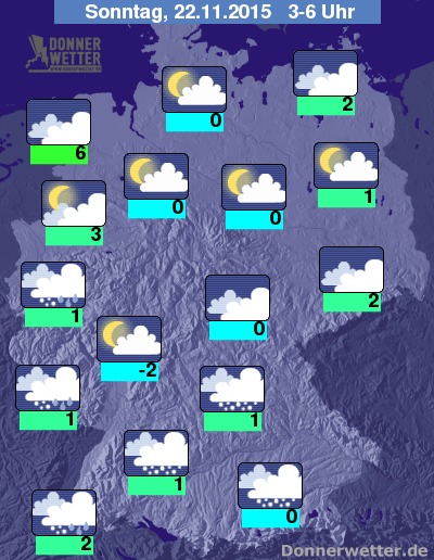 In der Nacht zum Sonntag ist der Himmel im Norden oft locker bis aufgelockert bewölkt, dabei bleibt es hier größtenteils trocken. Im Süden Deutschlands fällt unter dichten Wolken hingegen teils langanhaltender Schnee oder Schneeregen, auch über der breiten Mitte ist es meist stark bewölkt und es fällt gebietsweise Regen, Schneeregen oder Schnee. Es muss verbreitet mit Straßenglätte durch Schnee oder überfrierende Nässe gerechnet werden. Die Temperatur sinkt auf 6 Grad in Ostfriesland und bis auf frostige -2 Grad am Odenwald.