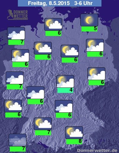 In der Nacht zum Freitag ist es im Nordosten noch oft sternenklar, sonst ziehen jedoch auch oft einige, teils dichte Wolken durch, gebietsweise ist es aber nur locker bewölkt. Es bleibt überall trocken. Die Temperatur sinkt auf 8 Grad in München und etwa 4 Grad im Vogtland.
