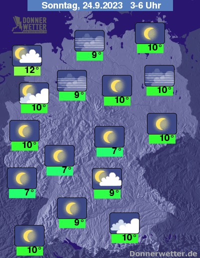 In der folgenden Nacht halten sich im Südosten oft dichte Wolken. Im Norden sind hier und da auch noch einige Wolken unterwegs. Im übrigen Land ist es aber verbreitet nur gering bewölkt oder sternenklar. Es bleibt überall trocken bei Tiefstwerten von 12 Grad an der Nordsee und 7 Grad im Saargau.