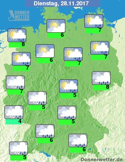 Am Dienstag ist es über Sachsen und dem Süden dicht bewölkt und hier fällt immer wieder Regen, sonst ist es im Land auch oft leicht bis aufgelockert bewölkt und lange Zeit trocken, einzelne Schauer sind dennoch möglich. Die Temperatur erreicht 4 Grad im Saargau und bis 8 Grad im nördlichen Emsland. An den Küsten weht ein starker und teils stürmischer Wind.