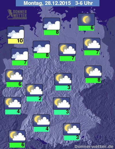 In der Nacht zum Montag ist es im äußeren Norden und im Nordosten oft sternenklar, im übrigen Norden ist es teils aufgelockert, teils aber auch stark bewölkt, jedoch weitgehend trocken. Weiter nach Süden hin ziehen verbreitet nur lockere, teils auch einige Wolken übers Land hinweg, dazu bleibt es trocken. Die Temperatur sinkt auf 10 Grad in Meppen und bis 2 Grad am Westerwald.