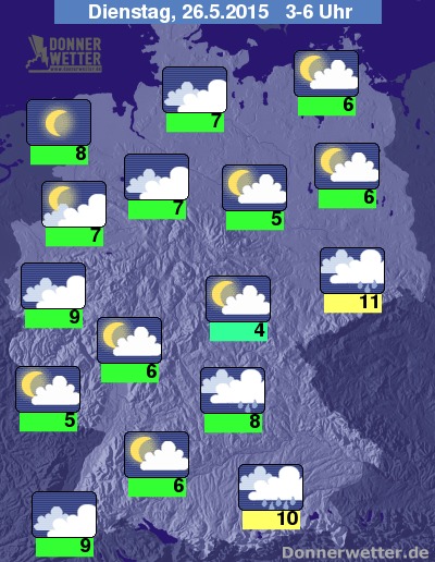 In der Nacht zum Dienstag fällt im Süden, aber auch im Osten des Landes noch teils langanhaltender Regen, in den anderen Landesteilen ist es oft aufgelockert, gebietsweise aber auch stark bewölkt und dabei jedoch weitgehend trocken. Die Temperatur sinkt auf 11 Grad in Görlitz und bis 4 Grad im Grabfeld.