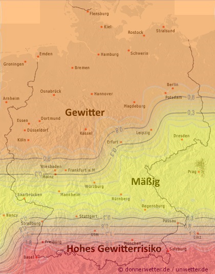 Die folgende Karte zeigt, wo bis in die Nacht in Deutschland die Gewittergefahr am höchsten ist.