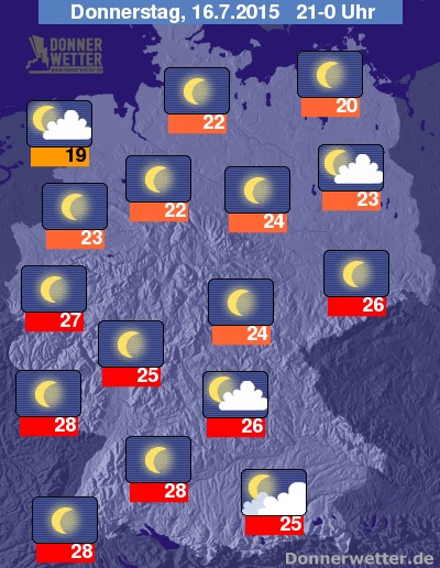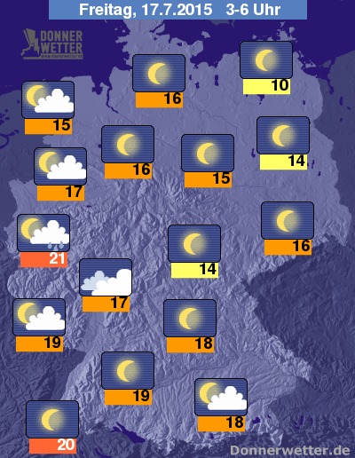 In der Nacht zum Freitag ziehen in den westlichen Landesteilen zum Teil dichte Wolken auf und im Westen selbst können sich auch Schauer und Gewitter entwickeln, sonst bleibt es überwiegend trocken. In den übrigen Landesteilen zeigt sich der Himmel zumeist sternenklar oder nur locker bewölkt und es bleibt trocken. Die Temperatur sinkt auf 21 Grad in Aachen und bis 10 Grad an der Müritz.