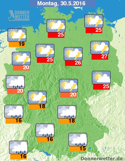 Heute bleibt es vor allem über der Nordhälfte Deutschlands oft schwülwarm und gewittrig, hier sind zum Teil auch schwere Gewitter mit Hagel und auch einzelnen Sturmböen möglich. Der Süden zeigt sich ebenfalls sehr durchwachsen, hier fällt häufiger und teils auch langanhaltender Regen. Die Sonne zeigt sich meist nur selten. Die Temperatur steigt auf kühle 15 Grad am Alpenrand und bis auf schwülwarme 27 Grad in Berlin.