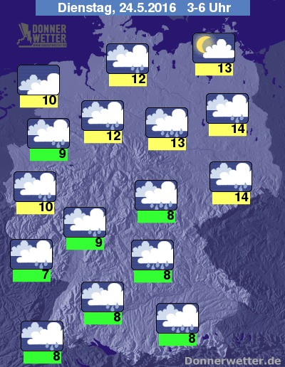 In der zweiten Nachthälfte gibt sich der Himmel über weiten Teilen Deutschlands bedeckt, einzelne Auflockerungen sind vor allem in der Osthälfte möglich. Schauer beschränken sich zunächst noch auf die südlichen und westlichen Bundesländer, in den frühen Morgenstunden des Dienstag weiten sich die Regengebiete dann aber auf das gesamte Bundesgebiet aus.
