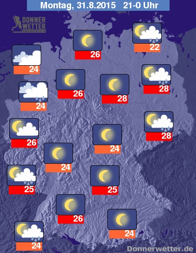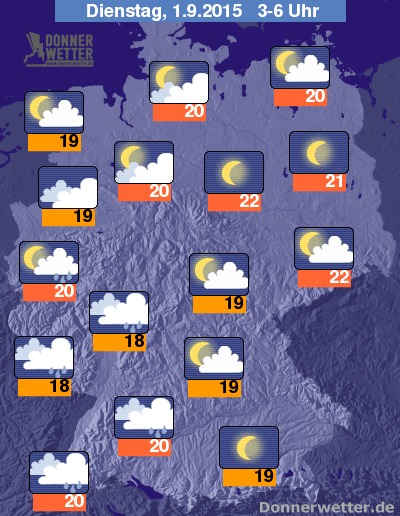 In der Nacht zum Dienstag ziehen im Südwesten und Westen der Bundesrepublik dichte Wolken auf, dabei fällt teils starker und gewittriger Regen. Im Norden und Nordwesten ist es meist aufgelockert, teils auch stark bewölkt, aber meist trocken. In den übrigen Landesteilen bleibt es weitgehend locker bewölkt oder klar und dazu trocken. Die Temperatur sinkt auf 22 Grad in Leipzig und bis 18 Grad im Saargau.