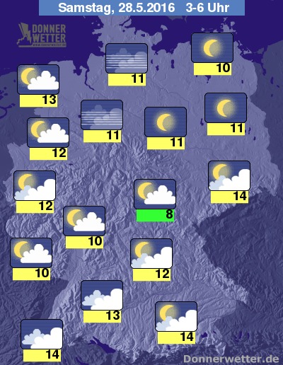 In der Nacht zum Samstag zeigt sich der Norden Deutschlands oft sternenklar oder auch mal locker bewölkt, jedoch trocken. Nach Süden hin werden die Wolken hingegen zahlreicher und zum Alpenrand auch immer dichter, dabei bleibt es allerdings weitgehend trocken. Nur selten bilden sich vereinzelte Schauer, noch seltener auch Gewitter. Die Temperatur sinkt auf 14 Grad in Freiburg und bis etwa 8 Grad am Thüringer Wald.
