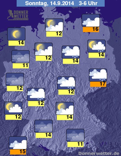 In der Nacht zum Sonntag bilden sich von der Mitte bis in den Osten des Landes weiterhin teils gewittrige Regengüsse, im Süden ist es häufig neblig-trüb, Regen fällt aber nur noch vereinzelt. Meist klar oder locker bewölkt ist es von Schleswig-Holstein, über den Nordwesten und Westen des Landes bis ins Saarland, dabei kann sich jedoch Nebel oder Dunst bilden. Die Temperatur sinkt auf 17 Grad in Dresden und bis 11 Grad am Starnberger See.