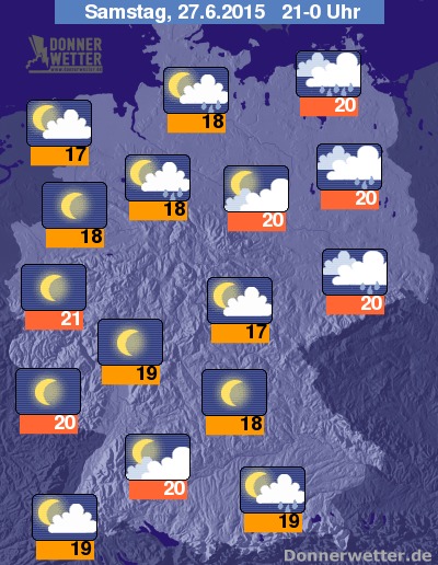 Heute Abend bilden sich vom Nordosten über den Osten bis hin zum Alpenrand weitere, teils kräftige Schauer und Gewitter. Im übrigen Bundesgebiet zeigt sich der Himmel dagegen zunehmend locker bewölkt oder sternenklar und es bleibt trocken. Die Abendtemperatur liegt bei 21 Grad in Köln und um 17 Grad in Ostfriesland.