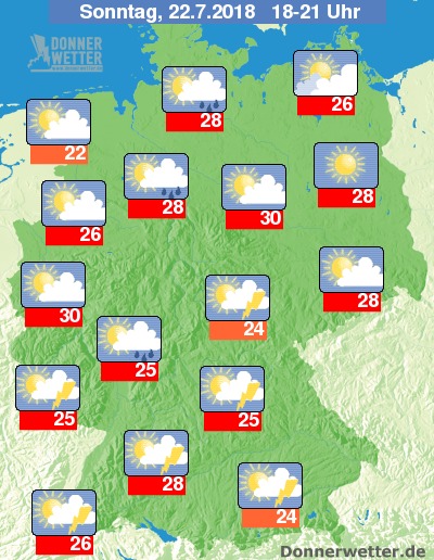 Heute Abend bleibt es über der Südhälfte weiterhin verbreitet schwülwarm und gewittrig, dazwischen kann sich hier und da zwar die Sonne zeigen, jedoch sind zum Teil kräftige Gewitter möglich. Weiter nach Norden hin überwiegt heiteres bis sonniges un trockenes Wetter, hier sind nur ganz lokal Schauer und Gewitter möglich. Die Temperatur liegt bei 22 Grad in Wilhelmshaven und bis 30 Grad in Bonn.