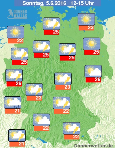 Heute Abend strahlt über dem Norden und Osten verbreitet die Sonne und es bleibt auch weitgehend trocken. Dagegen sorgen schwülwarme Luftmassen nach Südwesten hin noch für oft dichte Wolken und mögliche Schauer und einzelne Gewitter. Hier und da sind auch noch kräftige Gewitter möglich. Das Gewitterpotenzial nimmt jedoch insgesamt langsam ab. Die Temperatur liegt bei 22 Grad im Breisgau und um 26 Grad in Hannover.