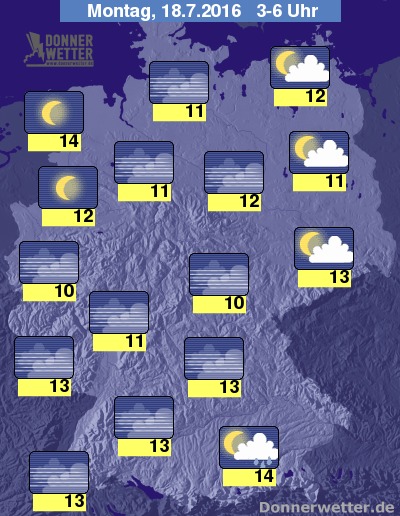 In der Nacht zum Montag sind im Süden anfangs noch gebietsweise Schauer und Gewitter möglich. Über dem übrigen Bundesgebiet ist es dagegen verbreitet sternenklar oder nur leicht bewölkt, im Nordosten und Osten zieht oft lockere Bewölkung durch, dabei bleibt es trocken. Stellenweise bildet sich Dunst oder Nebel. Die Temperatur sinkt auf 14 Grad in München und bis auf 10 Grad am Bergischen Land.