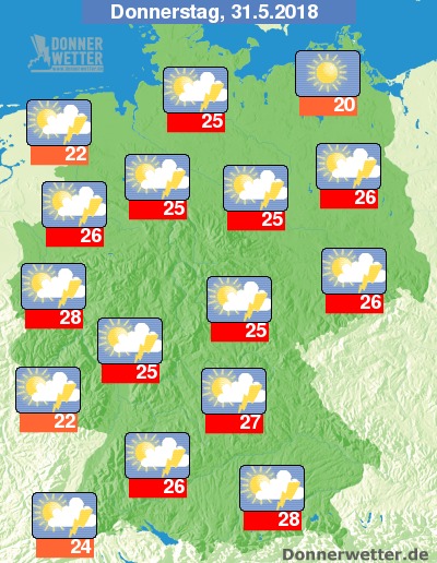 Am Donnerstag zeigen sich zum Teil heitere bis sonnige Abschnitte, gebietsweise ziehen jedoch auch dichte Wolken durch, dabei sind vielerorts Schauer und örtlich auch Gewitter möglich. Die Temperatur steigt auf 20 Grad auf Rügen und bis 28 Grad in München.