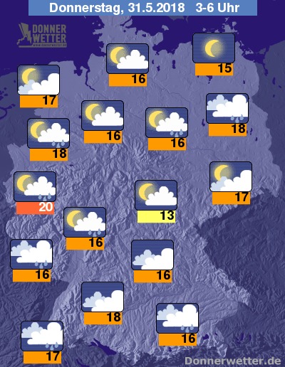 In der Nacht zum Donnerstag ist der Himmel im Norden meist nur gering bis wechselnd bewölkt, dazu bleibt es weitgehend trocken. Im übrigen Bundesgebiet ist es vor allem im Süden oft stark bewölkt, dabei sind einzelne Schauer und Gewitter möglich. Die Temperatur sinkt auf tropische 20 Grad in der Kölner City und bis 13 Grad im Grabfeld.