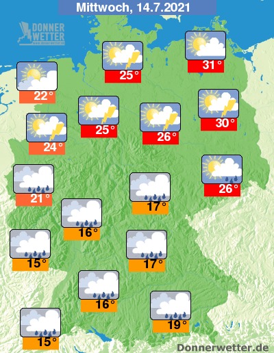 Heute halten sich verbreitet dichte Wolken. An der Nord- und Ostsee ist es hingegen oft heiter, teils ziehen hier mehr Wolken durch, aber es bleibt dabei weitgehend trocken. Dagegen fällt über der Südwesthälfte Deutschlands verbreitet, teils langanhaltender, ergiebiger und gewittriger Regen. Im übrigen Bundesgebiet bilden sich örtliche Schauer und Gewitter. Die Temperatur steigt auf 15 Grad am Oberrhein und bis 31 Grad an der Müritz.