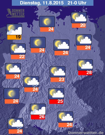 In der Nacht zum Mittwoch zeigt sich der Himmel über dem Süden Deutschlands weitgehend sternenklar, dabei bleibt es trocken. Weiter nach Norden hin ist es zumeist locker bis aufgelockert bewölkt, besonders nach Nordwesten hin aber auch verbreitet dicht bewölkt, dabei bleibt es ebenso trocken. Im Nordosten zeigt sich ein oft sternenklarer Himmel. Die Temperatur sinkt auf 21 Grad in Görlitz und bis 15 Grad im Eichsfeld.