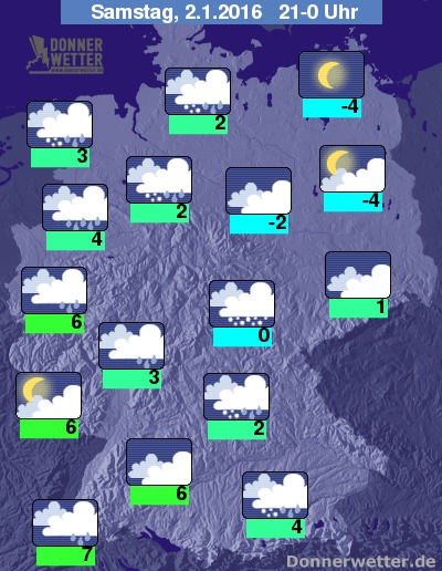 Im Südwesten und Westen lockert es gegen Mitternacht oft wieder auf und die Niederschläge klingen meist ab. Die Abendtemperatur liegt bei 7 Grad im Breisgau und um -4 Grad in Berlin. Im Norden weht teils starker, an den Küsten und auf den Bergen oft stürmischer Wind.