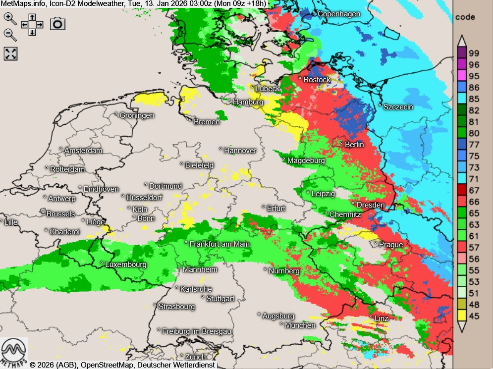 Die Modellkarten nach ICON für 00:00, 03:00 und 06:00 Uhr mit den Eisregenbereichen in rot, Schneefall in blau, Regen in grün: