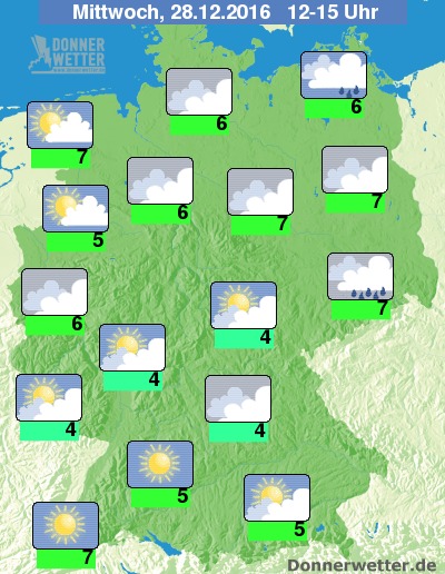 Heute Mittag und am frühen Nachmittag ist der Himmel in der Nordhälfte überwiegend bedeckt und gebietsweise ist mit Regen zu rechnen. Im Nordwesten mehr Sonne bei leichter Bewölkung. Richtung Süden etwas freundlicher mit einigen Sonnenabschnitten bei einem meist bewölktem Himmel.