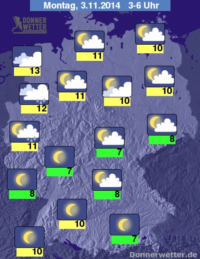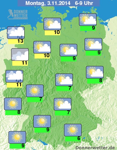 Im Nordosten geht es dagegen mit lockerer Bewölkung, im Süden häufig heiter in die neue Woche. Die Temperaturen steigen am Morgen hier auf Werte 6 bis 9 Grad C.