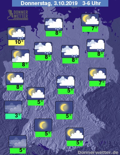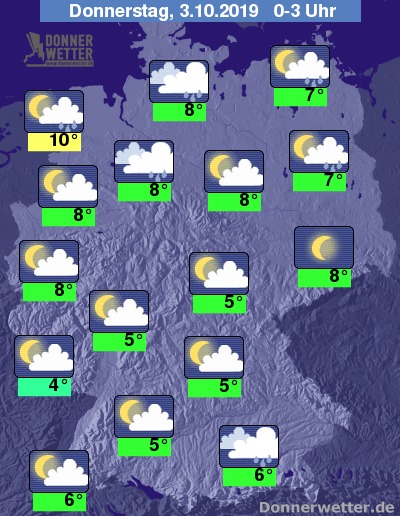 In der Nacht auf den Donnerstag ist der Himmel über dem Norden und Osten des Landes meist stark bewölkt oder bedeckt und zeitweise muss mit Schauern gerechnet werden. In den übrigen Landesteilen überwiegen lockere Wolken, im Süden kann es im Nachtverlauf auch aufklaren oder es bildet sich Nebel, und es bleibt meist trocken.