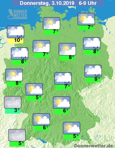 Der Feiertag startet in der Nordhälfte bedeckt oder aufgelockert bewölkt, an Ems und Oder kann aus einer geschlossenen Wolkendecke auch immer wieder etwas Regen fallen. Im Süden ist es teils heiter, teils locker bewölkt und es bleibt trocken. Im Südwesten kann sich in den Frühstunden Hochnebel halten.