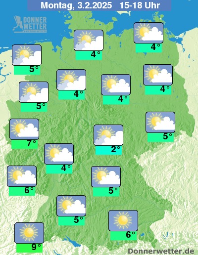 Am Montagnachmittag zeigt sich der Himmel nach Nebelauflösung über weiten Teilen des Landes heiter bis wolkig. In den Niederungen Süddeutschlands hält sich teils ganztägig zäher Nebel, auch im Nordwesten ist es wolkig; es bleibt aber meist trocken.