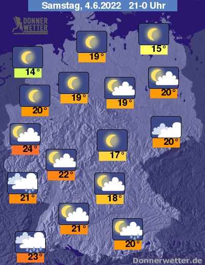 In der ersten Nachthälfte ziehen von Südwesten her neue schauerartige Regenfälle auf, lokal auch mit Gewittern einhergehend. In den übrigen Landesteilen überwiegt ein Mix aus sternenklarem Himmel oder geringer Bewölkung und es bleibt meist trocken.