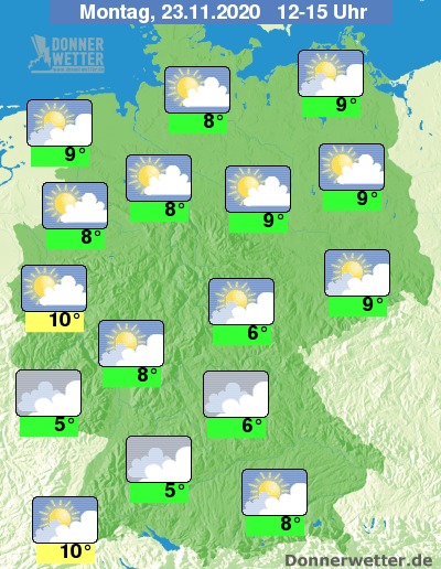 Die Temperaturen erreichen Werte meist um 6 bis 9 Grad, mit 10 Grad am mildesten ist es am Oberrhein sowie in der Kölner Bucht.