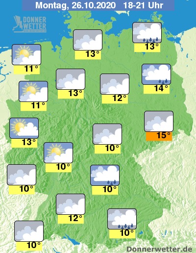 Die Temperaturen liegen am Abend bei Werten um 10 bis 15 Grad, später auf 12 bis 7 Grad fallend.