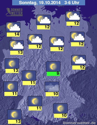 In der Nacht zum Sonntag zieht im Norden und Osten weitgehend lockere bis aufgelockerte Bewölkung durch, weiter südwestlich wird es dagegen verbreitet sternenklar, nur selten bildet sich Nebel oder Dunst. Die Temperatur sinkt bis zum Morgen auf 15 Grad auf den Nordseeinseln und bis etwa 9 Grad im Grabfeld.
