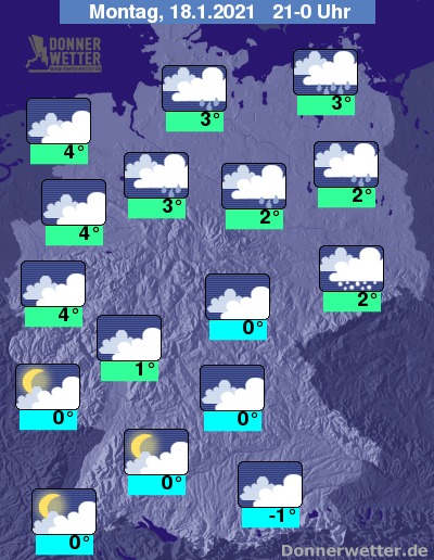 Am Montagabend bleibt der Himmel über weiten Landesteilen bedeckt, gebietsweise Auflockerungen beschränken sich vor allem auf den äußersten Süden und Südwesten Deutschlands. Im Norden und Osten muss in den Abendstunden zeitweise mit Regen-, in Mittelgebirgslagen auch Schneeschauern gerechnet werden; in den übrigen Landesteilen bleibt es meist trocken. Es bleibt speziell im Norden bei einem mäßigen bis frischen, auf den Gipfeln und an der See auch stürmischen Südwestwind.