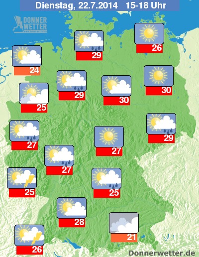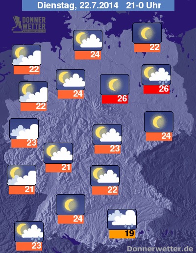 Am Abend können sich in Berlin-Brandenburg und vom Alpenvorland bis zu den Alpen zeitweise Schauer und Gewitter bilden, sonst ist die Bewölkung meist aufgelockert und besonders von der Mitte bis in den nördlichen Süden auch vielfach gering, und es bleibt weitgehend trocken. Die Abendwerte liegen bei schwülwarmen 26 Grad in Berlin und rund 19 Grad am Alpenrand.