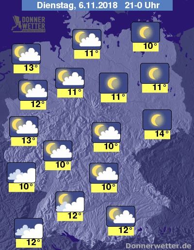 Am Abend präsentiert sich der Himmel über Deutschland meistens heiter oder nur von Wolkenschleiern überzogen. Es bleibt trocken. Die Temperaturen liegen vor der Dämmerung noch bei sehr milden 14 bis 19 Grad.