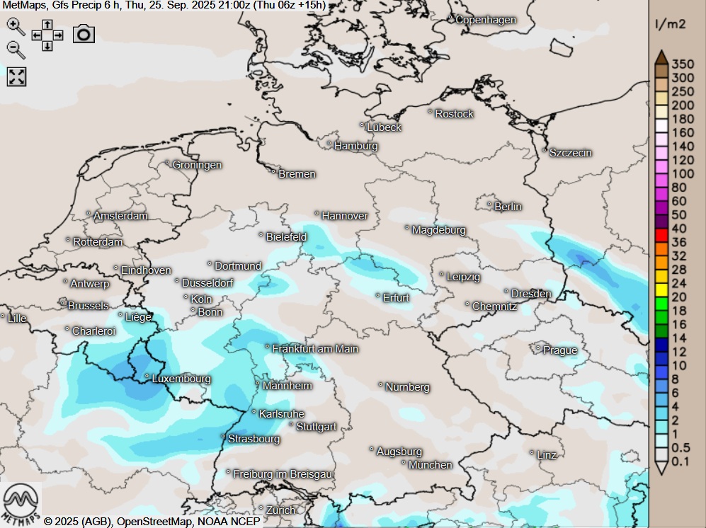 Die Wetter- und Temperaturkarte für Donnerstagnachmittag (15:00 Uhr) sowie die Sechs-Stunden-Regenmengen bis Donnerstagabend (21:00 Uhr) nach GFS: