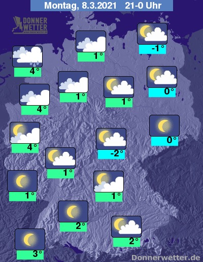 Die Temperaturen sinken am späten Abend auf Werte um 4 Grad am Niederrhein und -2 Grad in Erfurt.