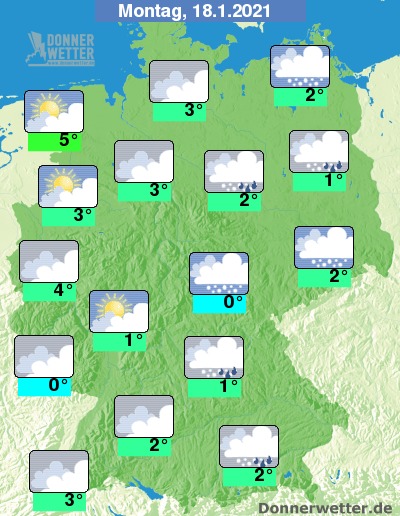Heute halten sich von Bayern bis nach Brandenburg dichte Wolken und es fällt zeitweise Schnee, teils auch Schneeregen. Weiter nach Westen hin ist es oft trüb oder stark bewölkt, vor allem im Südwesten und Nordwesten zeigen sich aber auch oft heitere Abschnitte, dabei bleibt es trocken. Die Temperatur steigt auf 0 Grad im Saargau und bis 5 Grad im nördlichen Emsland.