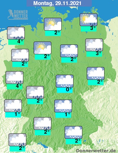 Heute ist es überwiegend stark oder dicht bewölkt, zum Teil ist es auch neblig-trüb. Aufheiterungen zeigen sich vor allem im Norden, hier bleibt es auch meist trocken, während im übrigen Bundesgebiet gebietsweise Schnee oder Schneeregen fällt. Die Temperatur steigt auf 0 Grad in Erfurt und bis 4 Grad in Bonn.
