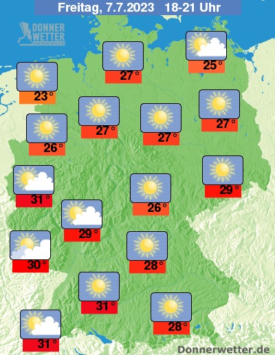Heute Abend ziehen im Südwesten und Westen einige, meist lockere Wolkenfelder auf. Im übrigen Land bleibt es aber weiterhin sonnig, weitgehend wolkenlos und trocken. Die Temperatur liegt bei 23 Grad in Wilhelmshaven und 31 Grad in Freiburg.