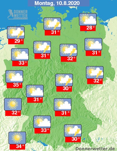 Am Montag ist es überwiegend heiter bis sonnig, vor allem am Nachmittag ziehen hier und da auch einige Quellwolken auf, dabei besteht ein leichtes Schauer- und Gewitterrisiko. Die Temperatur steigt auf sommerliche 28 Grad in Rostock und bis auf drückende 35 Grad in Bonn.