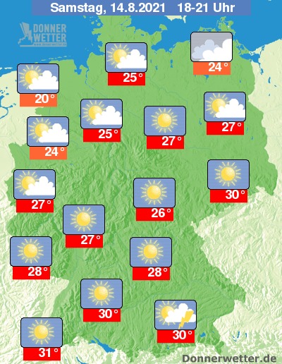 Heute Abend halten sich im Küstenumfeld gebietsweise dichte Wolken, auch im übrigen Norden ziehen hier und da einige, meist lockere Wolken durch. Weiter nach Süden hin ist es hingegen weitgehend sonnig. Es bleibt überall trocken bei Werten von 20 Grad in Cuxhaven und bis 31 Grad in Freiburg.