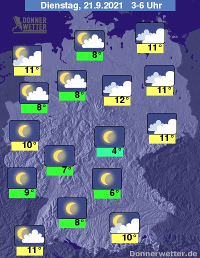 In der Nacht zum Dienstag halten sich über dem Nordosten und Osten des Landes weitgehend dichte Wolken. Im Norden und Südosten ist es meist aufgelockert und im übrigen Land meist nur gering bewölkt oder sternenklar. An der Ostsee sind vereinzelte Schauer möglich, sonst bleibt es aber landesweit trocken. Die Temperatur sinkt auf 12 Grad in Magdeburg und bis 4 Grad in Jena.