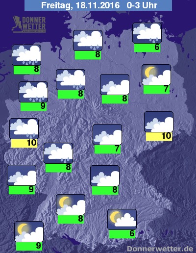 Auch am späten Nachmittag und in den Abendstunden bleibt das Regenrisiko im ganzen Land hoch. Dazu liegen die Höchstwerte in den kommenden Stunden bei milden 9 bis 13 Grad. Jedoch nehmen gegen Abend von Westen her die Windgeschwindigkeiten deutlich zu. Zwischen Nordsee und Schwarzwald ist mit Sturmböen, in den Höhenlagen auch mit schweren Sturmböen, zu rechnen.